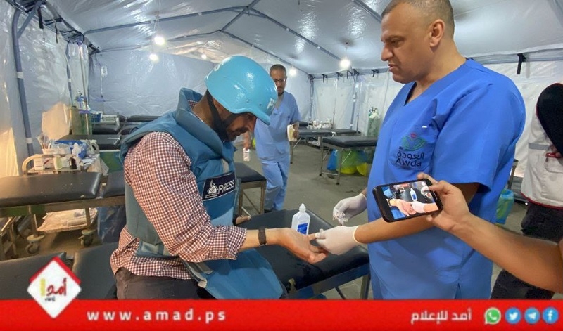 وأفادت مراسلة "أمد للإعلام"، أن المصور الصحفي محمد الصوالحي أصيب بشظية في يده، أثناء تغطيته للقصف على مخيم النصيرات وسط قطاع غزة.