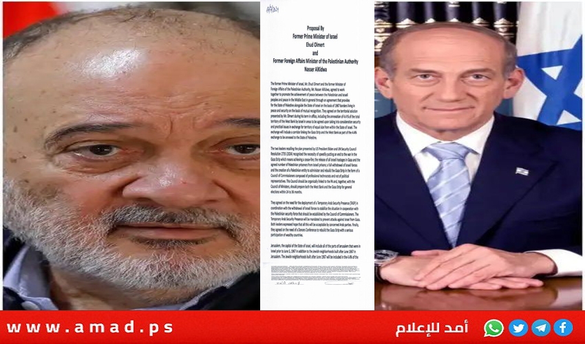 أمد/ عواصم: اقترح رئيس الوزراء الإسرائيلي الأسبق إيهود أولمرت ووزير الخارجية الأسبق للسلطة الفلسطينية ناصر القدوة مشروعا حول السلام ومستقبل قطاع غزة والقدس، جاء فيه:
