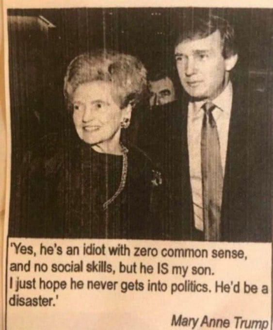 أمد/ واشنطن: شارك مستخدمو وسائل التواصل الاجتماعي صورة على الإنترنت تدعي أنها تُظهر اقتباسًا لماري آن ترامب، والدة الرئيس دونالد ترامب، يقول: "نعم، إنه أحمق بلا حس سليم، ولا مهارات اجتماعية، لكنه ابني. أتمنى فقط ألا ينخرط في السياسة أبدًا. سيكون كارثة".