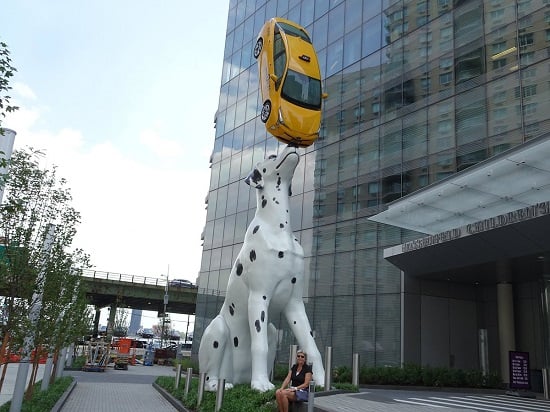 خارج مستشفى هاسنفيلد للأطفال في نيويورك، يقف تمثال ضخم لكلب يوازن سيارة أجرة على أنفه، صمم هذا التمثال النحات دونالد ليبسكي ليضفي جوًا من البهجة على الأطفال المرضى وعائلاتهم، السيارة مزودة بتفاصيل دقيقة مثل مساحات زجاج تعمل في المطر، مما يجعلها قطعة فنية مفعمة بالحياة والمرح.