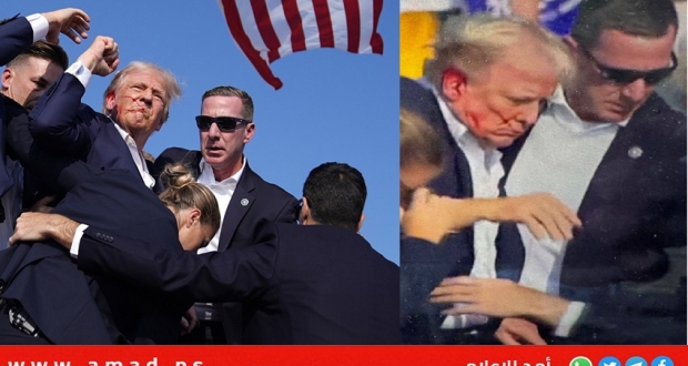 وتداول رواد مواقع التواصل الاجتماعي لقطات تظهر الدماء على وجه ترامب من الجهة اليمنى بعد إطلاق نار خلال كلمته في بنسلفانيا.