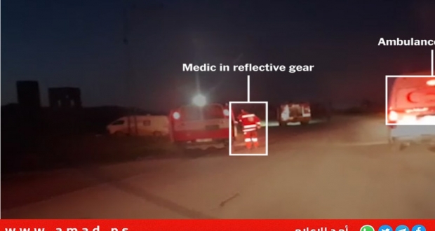 ويظهر تسجيل فيديو، عثر عليه على هاتف أحد المسعفين الذين عثر عليهم مع 14 عامل إغاثة آخرين في مقبرة جماعية بمدينة رفح بغزة أواخر مارس، أن سيارات الإسعاف وشاحنة الإطفاء التي كانوا يستقلونها كانت تحمل علامات واضحة، وكانت أضواء الطوارئ مضاءة عندما أطلقت القوات الإسرائيلية وابلا من النيران عليها.