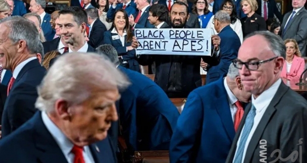 واشنطن: بعد دقائق من بدء خطاب حالة الاتحاد الذي ألقاه الرئيس الأمريكي دونالد ترامب، فوجئ الجميع بإخراج النائب الديمقراطي عن ولاية تكساس، آل غرين، من قاعة مجلس النواب، إثر رفعه لافتة كتب عليها: "السود ليسوا قرودًا".